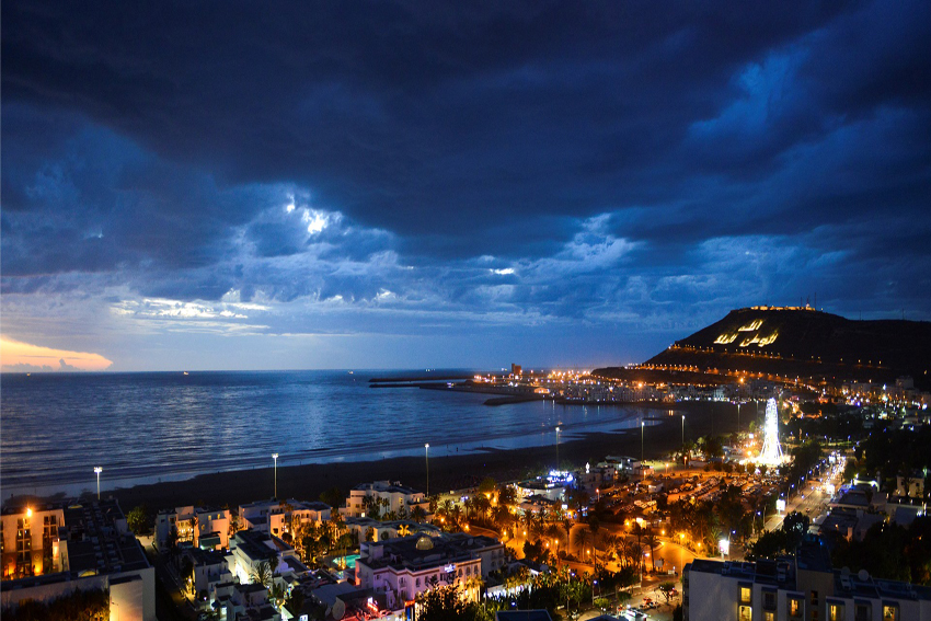 - Agadir: Une petite ville Amazighe du sud-ouest marocain, située sur la côte atlantique, dans la région du Souss, à 508 km au sud de Casablanca, à 173 km d'Essaouira et à 235 km à l'ouest de Marrakech. Avec 900 000 habitants en 2012, dans un site magnifique et sous un climat idyllique propre à vous faire oublier tous vos soucis. Longée par des boulevards bordés de palmiers et ses bars sur le front de mer. Agadir, la première station balnéaire du Maroc, possède une atmosphère décidément très occidentale.